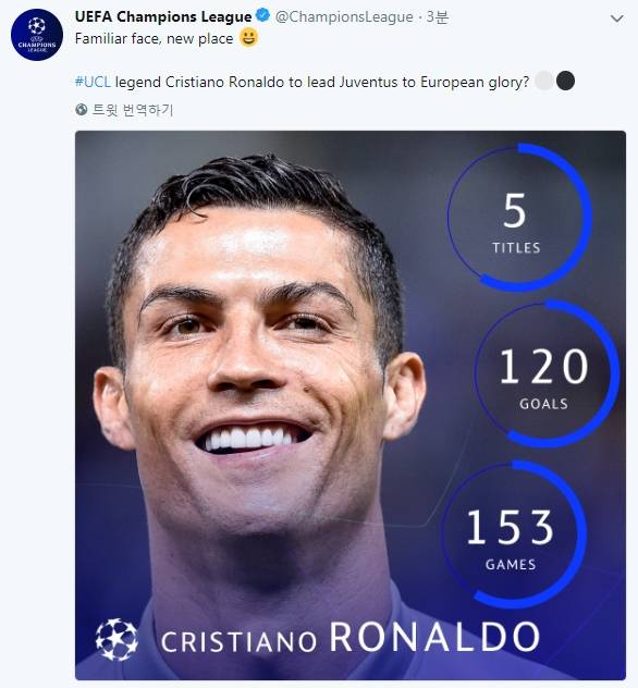 어느덧, 올 시즌 UEFA 챔피언스리그 본선 개막이 4일 앞으로 다가왔다. UEFA는 15일(현지시간) 공식 SNS를 통해 "챔피언스리그 레전드 호날두가 유벤투스에 유럽 정상의 영광을 안겨줄까"라는 글과 함께 호날두의 역대 챔피언스리그 통산 기록을 조명했다.