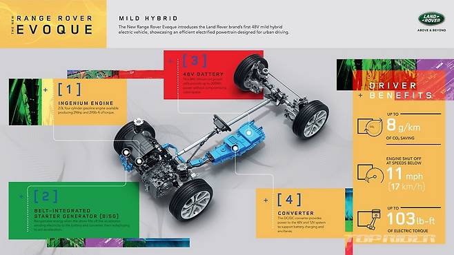 신형 이보크는 구성 요소의 90% 이상을 새롭게 설계했다. 재규어랜드로버의 새로운 아키텍처(PTA)가 적용된 첫 번째 모델로 애초부터 전기차 생산을 고려됐다. 특히 디젤과 가솔린 등 모든 자동변속기 모델에는 8Ah 배터리와 48V 마일드 하이브리드 시스템이 적용된다.
