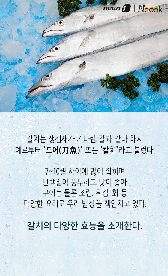 (서울=뉴스1) 박라경 에디터 = 갈치는 생김새가 기다란 칼과 같다 해서 예로부터 ‘도어(刀魚)’ 또는 ‘칼치’라고 불렀다. 7~10월에 많이 잡히며 단백질이 풍부하고 맛이 좋아 구이는 물론 조림, 튀김, 회 등 다양한 요리로 우리 밥상을 책임지고 있다. 갈치의 효능을 소개한다.