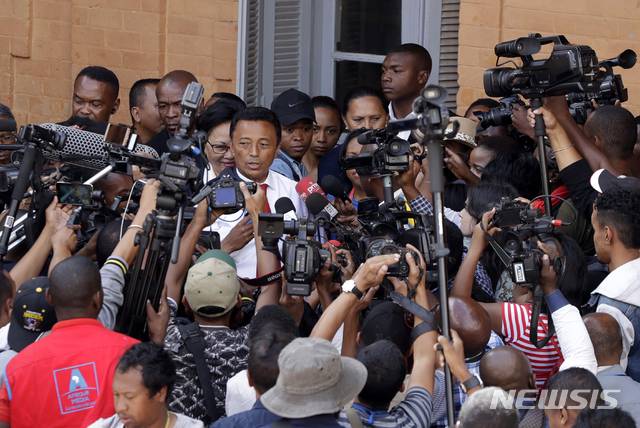 【안타나나리보=AP/뉴시스】마다가스카르의 대선 투표일인 19일(현지시간) 수도 안타나나리보의 한 투표소에서 투표를 마친 마르크 라발로마나나 전 대통령이 기자들에게 발언하고 있다.