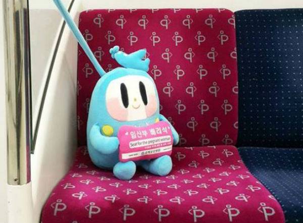 나르 인형의 손에는 '임산부 배려석'이라고 글귀가 쓰여 있는 분홍색 패널을 들고 있어 이 자리가 임산부들을 위해 비워달라는 의미를 강조하고 있습니다.