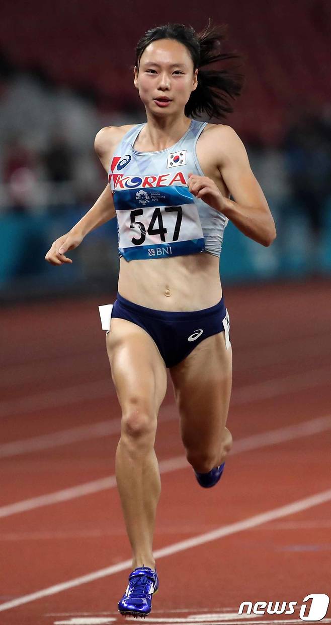 (자카르타(인도네시아)=뉴스1) 김명섭 기자 = 육상 여자 국가대표 김민지가 26일 인도네시아 자카르타 겔로라 붕 카르노(GBK) 스타디움에서 열린 여자 육상 100m 준결승전에서 역주하고 있다. 2018.8.26/뉴스1