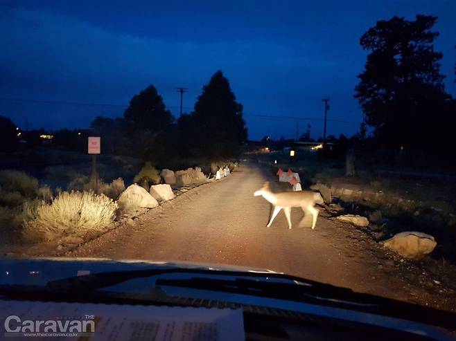 낮에는 더워서 반팔을 입고 여행을 했다 물론 사막지대를 계속 여행했다는 점에서 우리는 별다른 생각없이 그랜드캐년에 입성했다. 그런데 그랜드캐년에는 일단 나무가 많은 점이 특이했다. 해발이 높다보니 습도가 있고, 그래서 나무가 자라고 동물도 있다는 것이다. 그러나 그 동안 동물을 본다는 생각은 전혀 못했는데, 캠핑카를 몰고 그랜드캐년 안을 저녁에 돌아다니다가 사슴 같은 동물이 나를 쳐다보고 있어서 깜짝 놀랐다. 그런데 오히려 이 녀석은 놀라지도 않고 자주 본 일이라는 듯 나를 보고 눈을 껌벅 껌벅 하더니 길을 건넌다. 나는 브레이크를 밟고 기다렸는데, 이 녀석 뒤로 한 무리가 길을 건너기 시작한다. 마지막에 새끼가 두 마리 더 건너고 나서야 우리는 가던 길을 계속 갈 수 있었다. 실제로 캠핑카 여행을 하다가 이렇게 만난 동물들은 신기함과 흥분을 우리에게 안겨줬으며, 그동안의 사막지대의 여행과 또 다른 감흥을 느낄 수 있었다.