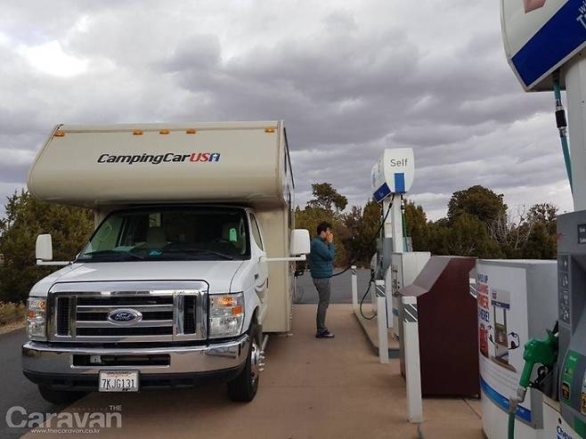 그랜드캐년으로 향하는데 기름이 떨어져 가는 길에 서는 게 아닌가 심장이 쿵쾅거렸다. 그랜드캐년 완전히 안쪽에 들어가기 전엔 주유소가 없었다. 그때서야 일행이 하는 말. ‘그때 렌터카 빌려줄 때 주유게이지가 중앙의 빨간선 넘으면 무조건 주유소 보일 때 주유하고 가라고 했어요!’라고 하는 것이다. 나는 왜 차를 넘겨받을 때 그 말을 흘려들었을까 하고 자책을 해 보았다. 캠핑카는 일반 승용차보다 기름을 많이 먹는다. 그래서 주유게이지가 중간 이하로 내려가면 바로 주유를 하는 게 이런 사고를 방지할 수 있다. 물론 이런 사고가 생기면 어떻게 할지 막연할 수 있는 우리는 그래도 물어볼 수 있는 캠핑카여행 업체라도 있으니 다행이라고 생각하며 가는 데까지 가 보았다. 다행이 그랜트캐년 안쪽에 주유소가 있었다. 주유하라는 빨간불이 켜진지 70킬로 정도는 더 달린 거 같았다. 일행 모두는 여행 중에 가장 기쁜 일이라도 생긴 것처럼 주유소를 보면서 환호성을 질렀다. 정말 안도의 큰 한숨이 나왔다.