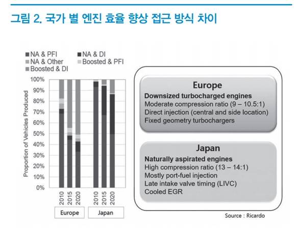 이와 같이 모든 자동차 회사들은 엔진의 효율을 높이기 위한 많은 기술들을 적용하고 있지만, 자동차용 엔진의 열효율 향상을 추구하는 방식은 <그림 2>와 같이 지역마다 다르다고 할 수 있다.