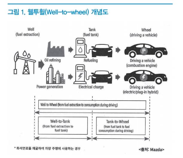 자동차 산업의 선진국인 일본과 독일은 전기자동차가 대세임을 인정하면서도 내연기관의 가능성에 여전히 무게를 두고 있다. 이런 가능성의 이유를 웰투휠(Well to Wheel, WTW)로 설명할 수 있다. WTW는 <그림 1>과 같은 에너지 생성 단계부터 소비 단계까지의 효율에 대한 개념이다. 즉 내연기관 자동차 운행을 통해 배출되는 유해배출 가스뿐만 아니라 전기나 수소의 생성 단계에서 발생하는 유해 배출가스까지 고려해야 한다는 것이다. 전기의 생성을 위하여 다양한 종류의 에너지원을 사용하고 있지만, 청정에너지로 분류되는 풍력이나 태양광의 비율은 5% 미만이고, 여전히 화석연료의 비율이 매우 높은 실정이다. 현재의 내연기관 연비를 30% 정도 개선한다면 내연기관 자동차는 LNG(액화천연가스) 발전으로 생산된 전기를 사용하는 전기자동차와 동등한 CO2를 배출한다. 이처럼 내연기관 자동차도 가능성은 있지만, 현재의 기술수준에 만족하고 안주한다면 가까운 시일 내에 다른 동력원에게 자리를 내어주게 될 것임이 명백한 사실이므로 현재도 많은 자동차 회사들은 내연기관 엔진 개발에 많은 비용을 투입하고 있다.