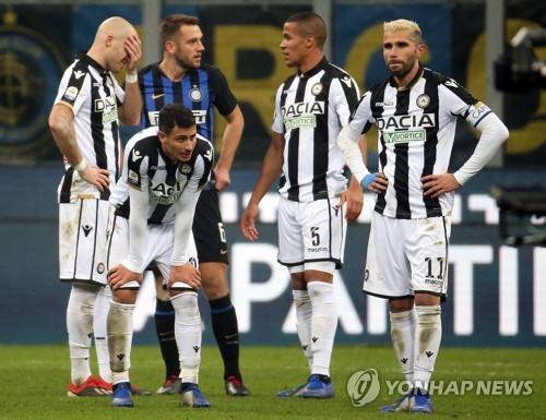 epa07234087 Udinese's players react during the Italian Serie A soccer match between FC Inter and Udinese Calcio at 'Giuseppe Meazza' stadium in Milan, Italy, 15 December 2018. EPA/MATTEO BAZZI