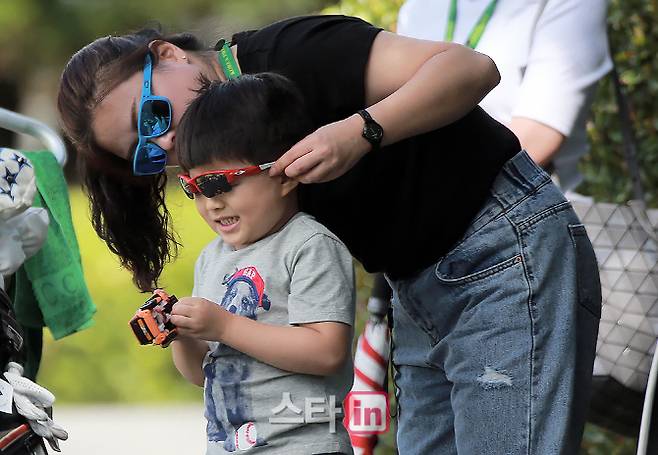 [이데일리 골프in 양산(경남)=박태성기자] 17일 경남 양산에 위치한 통도 파인이스트 컨트리클럽(파72/7,348야드)에서 2018 KPGA 코리안투어의 하반기 시작을 알리는 '동아회원권그룹 부산오픈'(총상금 5억원 우승상금 1억원) 2라운드가 열린 가운데,김형태(41)의 아내와 아들이 응원하기 전 선글래스를 쓰고 있다.