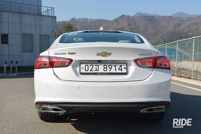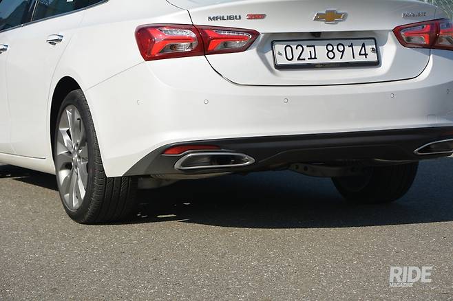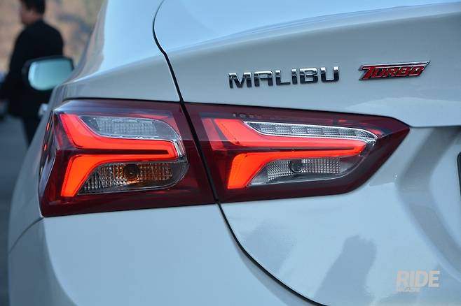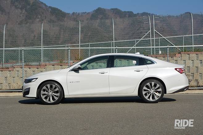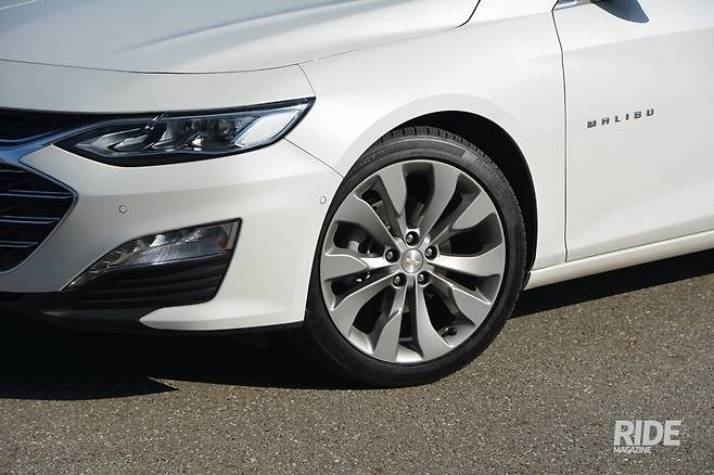 측면부는 휠, 디자인 모두 기존과 동일하다. 곡선은 스포츠백 스타일로 완만하게 내려가서 트렁크 끝에서 살짝 위로 치켜 올라간다. 전조등에서 시작한 위쪽 캐릭터 라인과 하부에서 시작된 아래쪽 캐릭터 라인은 뒷바퀴 위쪽을 향해서 부드럽게 정리된다. 1열 두 캐릭터 사이에는 말리부 엠블럼이 장착되었다. 2리터 터보 모델에는 19인치 휠이 끼워져 있는데, 이 휠의 디자인은 마치 항공기의 터보팬을 떠오르게 한다. 타이어는 컨티넨탈의 프로 콘택트 245/40R19 타이어가 적용되었다.