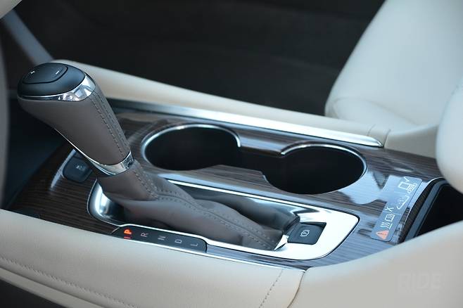 변속 레버는 동일하다. 레버 아래쪽에는 전자식 주차버튼이, 위쪽에는 자세제어 OFF버튼과 후방 감지기, 측후면 감지기 OFF 버튼이 있다. 변속레버는 여전히 토글 스위치가 위에 있는 방식이다. 수동으로 변속하려면 L위치에 놓고 버튼을 조작하면 된다. 8단 변속기가 들어가면 패들쉬프트가 적용될까?