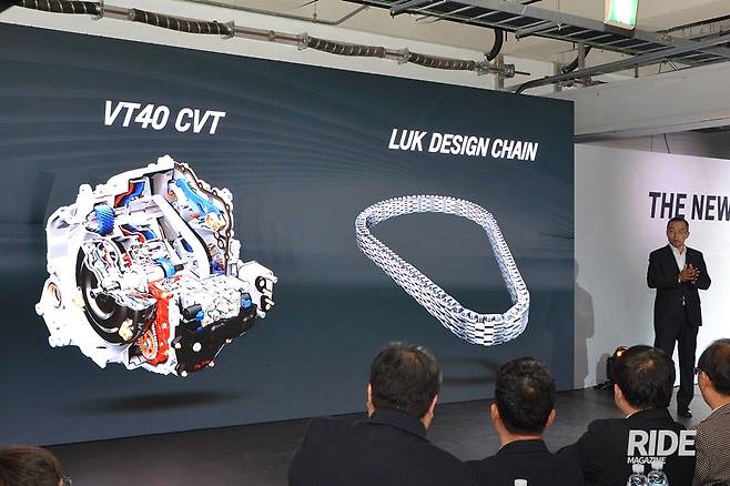 VT40 CVT는 변속 딜레이가 없는 만큼, 엔진 효율을 극대화한다. 기존에는 꺾이기 좋게, 가로측으로 나뉘어 있는 스틸 밸트를 사용했다. VT40에는 세로로 수 많은 체인들이 엮여있는 Luk 체인 밸트를 사용해 효율을 높였다. 또 가속감을 주기 위해 고부하 영역에서는 기존의 자동변속기처럼 톱날 (Sawtooth)느낌의 변속감을 추가했다.