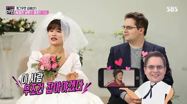 이어 김혜선은 "내가 개그우먼인 걸 몰랐을 때 말하길 싫었다. 이미지가 바뀔 수 있으니까 말이다. 그래서 말 안하다가 '사실 나 개그우먼이었는데 영상 보여줄까?' 그래서 보여줬더니 사랑스럽다고 했다. 이 사람 무조건 잡아야겠다 생각했다"고 회상했다.