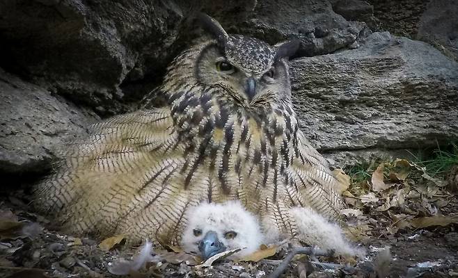 여기서 수리부엉이를 처음 봤을 때는 4년 전 설 쇠고 얼마 지나지 않았을 때였다. 혹한의 정월이었는데 새가 바위 위에서 알을 품고 있었다. 절벽 사이에 놓인 둥지라고 해야 찬 바위 위에 얇게 깔린 흙이 전부다. 암컷은 알을 품을 때면 가슴팍 털을 뽑아 맨살로 알에 자신의 온기를 전한다고 했다. 또 풍성한 깃털은 알의 온기를 지켜 체온을 빼앗기지 않는 이불 역할을 한다. 둥지가 볕이 잘 드는 방향으로 자리를 잡고 있어 다행이었다.