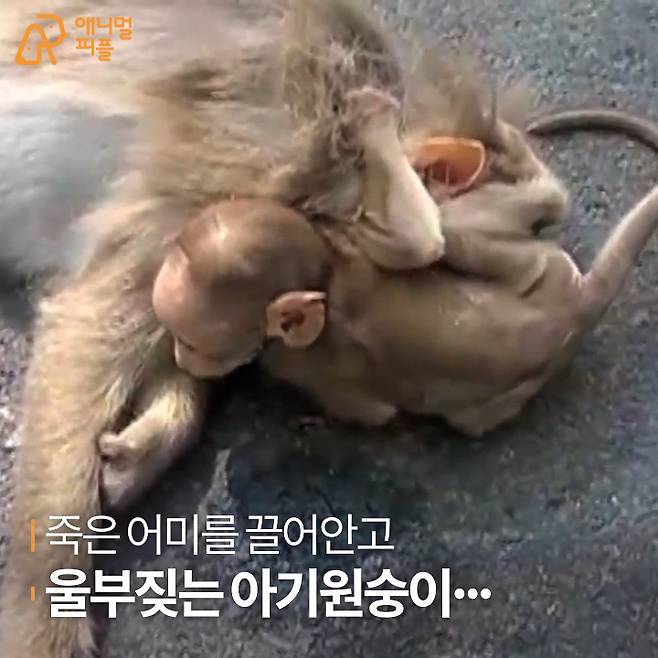 어미원숭이가 차에 치이는 것을 본 새끼원숭이는 재빨리 곁으로 달려가 어미를 흔들어 깨웠다.