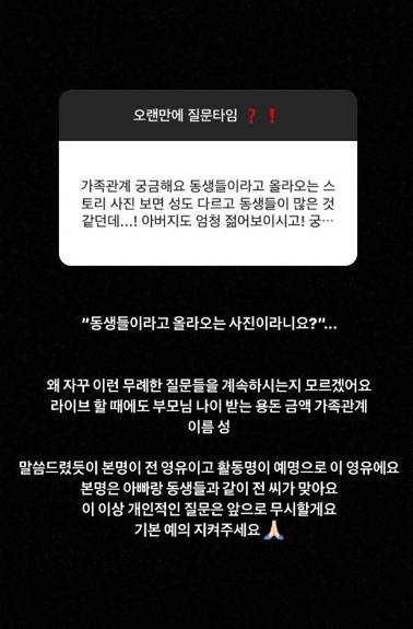 이어 "본명은 아빠랑 동생들과 같이 전 씨가 맞아요. 이 이상 개인적인 질문은 앞으로 무시할게요. 기본 예의 지켜주세요"라고 말했다.