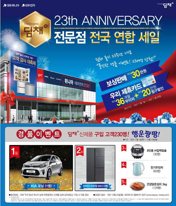 대유위니아서비스는 30일까지 전국 200여개 전문점에서 '딤채 출시 23주년, 전국 연합 세일'로 보상판매와 경품 이벤트를 실시한다고 5일 밝혔다.