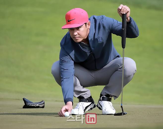 영화배우 김성수가 그린에서 라인을 살피고 있다.