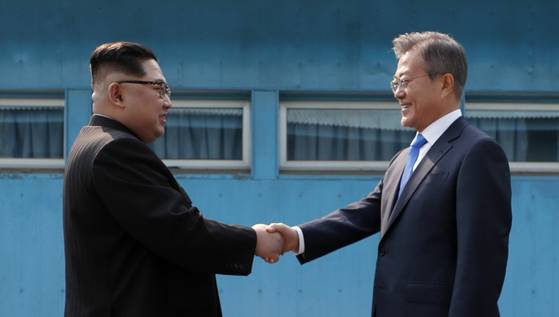 4월 27일 1차 판문점 회담. 문 대통령과 김 국무위원장이 4월 27일 판문점 군사분계선(MDL)을 사이에 두고 악수를 위해 손을 내밀고 있다. 북한의 지도자가 전쟁으로 갈라진 분단의 선을 넘은 것은 6·25 이후 처음이었다. 김상선 기자