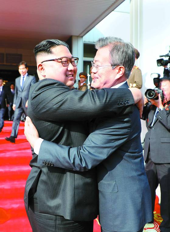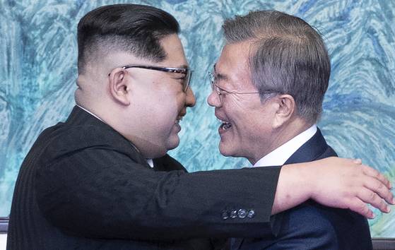 문재인 대통령과 김정은 위원장이 26일 오후 판문점 북측 통일각에서 정상회담 마친 후 헤어지며 포옹하고 있다. [사진 청와대]