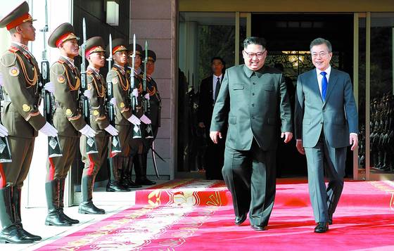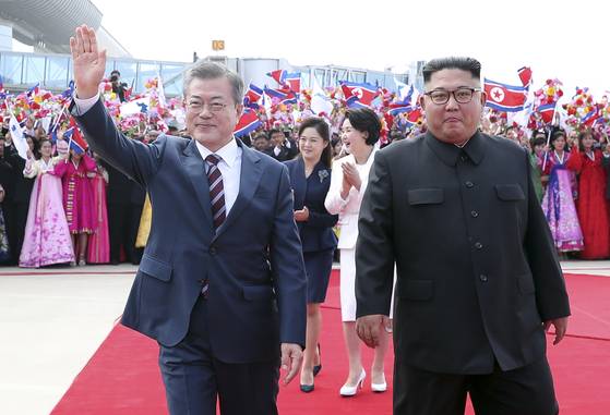 문재인 대통령과 부인 김정숙 여사, 김정은 국무위원장과 부인 리설주 여사가 18일 오전 평양 순안공항에서 열린 공식 환영식에서 평양 시민들의 환영을 받으며 이동하고 있다. 평양사진공동취재단
