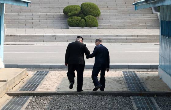 손을 맞잡은 문재인 대통령과 김정은 국무위원장이 이날 판문점 군사정전위원회 사무실 사이의 군사분계선(MDL)을 넘어 북측으로 들어갔다. 무단 '월경'은 "저는 언제 북한에 가볼 수 있을까요"라고 문 대통령이 말하자 김 위원장이 "지금 넘어갔다 오시지요"라며 손을 잡아끌면서 넘어가게 됐다. 사진공동취재단