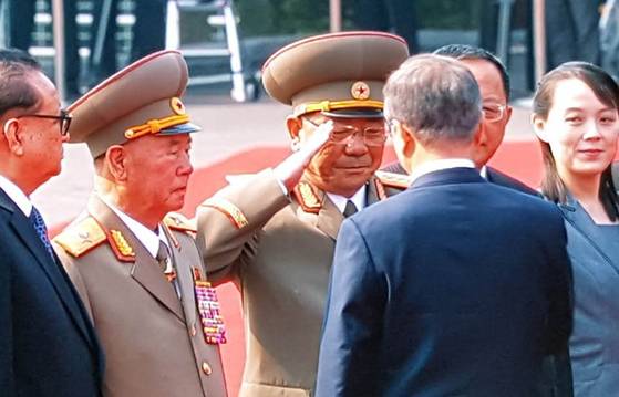 문 대통령이 판문점 남측 평화의 집 앞에서 열린 공식 환영식에서 북한의 리명수 총참모장의 거수경례를 받고 있다. 사진공동취재단
