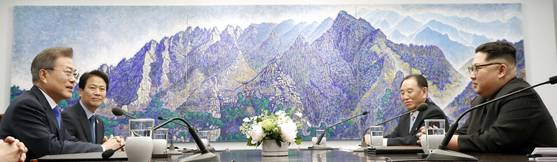 문 대통령과 김 위원장이 27일 판문점 평화의 집에서 2018 남북정상회담을 하고 있다. 왼쪽부터 시계방향으로 문 대통령, 임종석 대통령 비서실장, 북한 김영철 당중앙위원회 부위원장, 김 위원장. 사진공동취재단