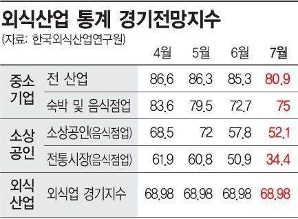 한국외식산업연구원이 발표한 외식산업 통계에 따르면 지난 7월 음식점을 운영하는 소상공인과 전통시장내 음식점업을 하는 자영업자들의 시장경기동향은 각각 52.1, 34.4로 집계됐다. 지난 5월 72.0, 60.8에서 6월 57.8, 50.9로 하락한 이후 7월에는 30 수준까지 하락한 것이다. 100 초과이면 호전이지만 100 미만이면 악화다. 전통시장 동향지수가 30대 수준인 것은 통계가 공개된 2014년 이후 처음이다.