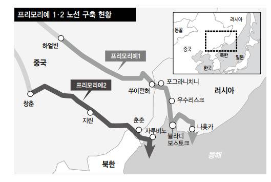 프리모리예 1과 2는 중국 동북3성과 러시아 연해주를 철도, 자동차도로, 항만 등으로 잇는 해륙복합운송루트를 일컫는 이름이다. 프리모리예 1은 ‘중국 하얼빈~쑤이펀허~러시아 포그라니치니(그로데코보)~블라디보스토크·나홋카·보스토치니항’으로, 프리모리예 2는 ‘중국 창춘~지린~훈춘~러시아 크라스키노~포시예트·자루비노항’으로 구성된다. 아직은 일부 구간만 완성된 상태다.