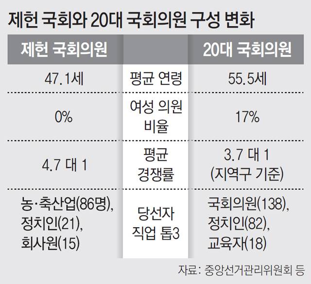 제헌 국회의원들의 평균 연령은 47.1세로 오늘날(20대 국회 평균 55.5세)과 비교하면 여덟 살 이상 차이 나는 '젊은 국회'였다.