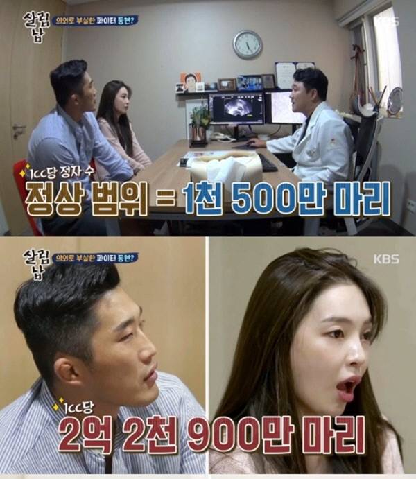 이후 검사 결과가 나왔다. 주치의는 송하율의 몸 상태에 대해 ‘정상’이라는 소견을 내놨다. 김동현에겐 “정액 1cc당 정자가 1500만 마리 이상이면 정상이라고 보는데, 김동현 씨는 1cc당 2억 2900만 마리나 된다”고 말했다. 이어 “이 정도면 바로 자연임신이 가능한 수치”라고 진단했다.