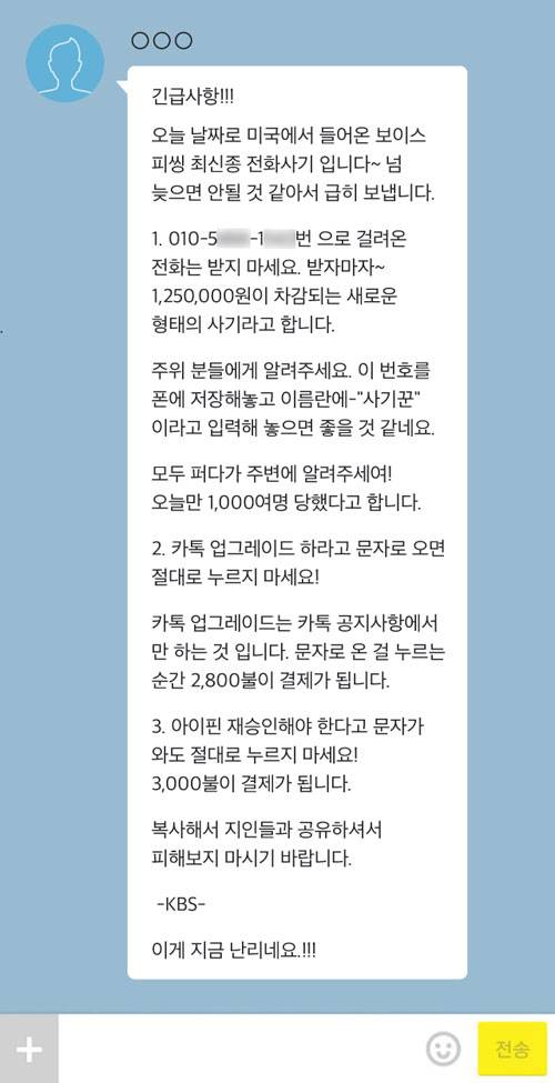 휴대전화를 이용한 신종 사기 수법을 조심해야 한다는 내용의 문자 메시지다. 위 내용과 함께 카톡 업그레이드와 아이핀(인터넷 개별식별 번호 서비스) 재인증을 빙자한 스미싱(휴대전화 문자를 통한 금융·개인정보 탈취 수법)을 경고하는 내용이다. 글의 말미에는 KBS가 정보의 출처로 명시됐다.