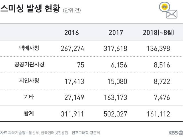 금감원은 올해 8월까지 스미싱 발생 건수는 16만 1천112건으로 지난해 같은 기간 발생 건수인 27만 4천196건에 비해 줄었지만, 최근 스미싱 문자의 대부분이 택배 배송확인과 반송 등 택배회사를 사칭하는 경우가 많아 추석 연휴 증가할 우려가 있다고 밝혔다.