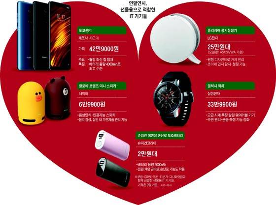 음성으로 간편하게 집 안 내 가전제품들을 조작할 수 있는 인공지능(AI) 스피커도 선물용으로 인기다. 국내에 출시된 AI 스피커 가운데 네이버의 '클로바 프렌즈 미니'와 카카오의 '카카오 미니c', SK텔레콤의 '누구 캔들'은 가격대가 10만원대 미만으로 비용 부담이 적다. 중소기업 에브리봇의 물걸레 로봇 청소기인 'RS500N'은 맞벌이 부부들에게 맞춤형 제품이다. 100% 충전 시 100분까지 사용이 가능해 집 안 곳곳을 혼자서 청소한다. 이중 범퍼를 장착해 집 안 가구, 제품과 부딪혀도 거의 손상을 입히지 않는다. 가격은 19만원대.