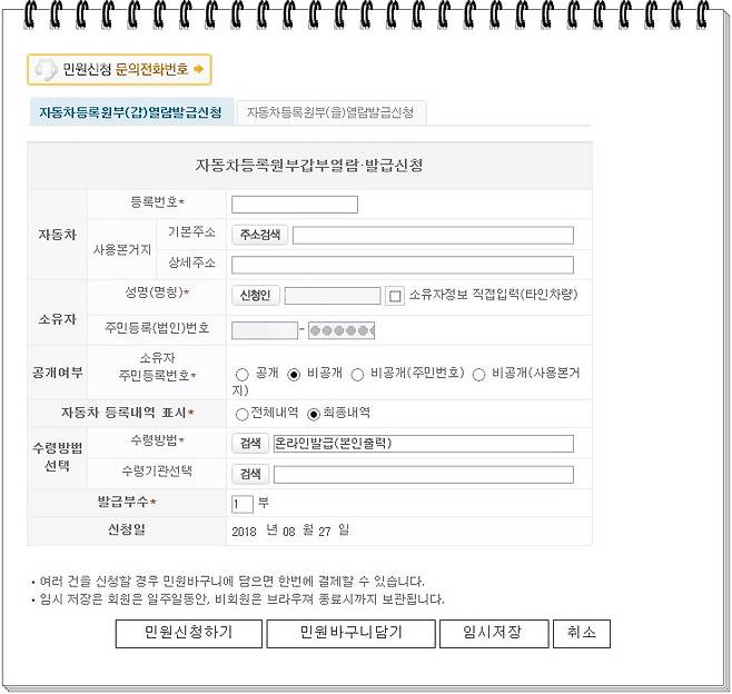 자동차등록원부(갑)과 (을)의 열람·발급 신청란은 '민원24(minwon.go.kr)'에서 '자동차등록원부'를 검색하면 쉽게 찾을 수 있습니다. 조회를 위해서는 반드시 공인인증서가 필요합니다.