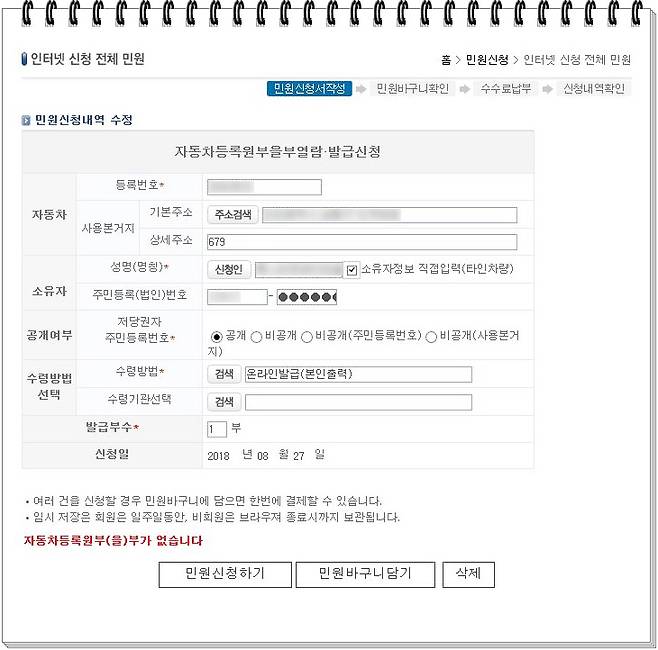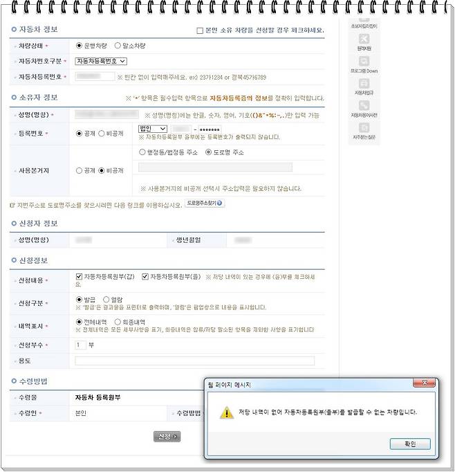 조회하는 과정에 신경 써야 할 부분도 있습니다. 자동차 번호는 물론 등록증 상의 주소와 실 소유주가 정확해야 합니다. 캐피털이나 파이낸셜로 등록된 경우에는 입력 과정에서 틀리기도 쉽습니다. 가령 소유주가 SB금융일수도 있고, 에스비금융일수도 있고, 에스비파이낸셜코리아일수도 있거든요. 입력한 내용이 사실과 조금만 달라도 조회가 되지 않으니 주의해야겠죠?