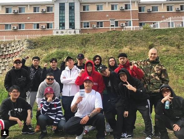 사진 속 딥플로우, 넉살, 오디(ODEE), 이로한(웹스터 비) 등은 강원도 화천에 위치한 제7사단 신병교육대 앞에서 던밀스 입대를 응원하고 있다.