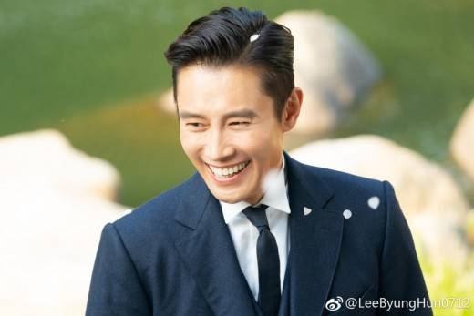 사진에서 이병헌은 검은색 정장을 입은 채 어딘가를 바라보며 환하게 미소를 짓고 있다.