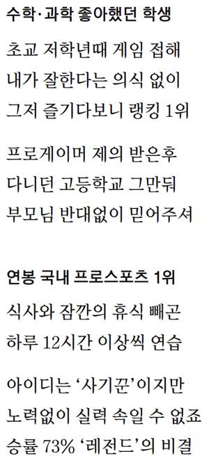 ▷보통 게임이라는 말을 하면 부모님들이 안 좋은 시선으로 바라보는 경우가 많은데, 우리 집은 그런 시선이 없었다. 자기 공부하면서 성적 내면 인정해줬고, 게이머가 되겠다고 했을 때도 반대 대신 지지해줬다. 아버지는 "하고 싶은 대로 해라"고 딱 잘라서 말해줬을 정도고, 심지어 선생님도 비슷한 반응을 보였다. 중학교 때 집에서 게임을 열심히 했지만 학교 성적도 상위권이었다. 그런데 고등학교 1학년 1학기 정도까지는 성적 유지가 됐는데 2학기부터는 떨어지더라(웃음). 2학년 때 프로게이머가 되면서 학업을 중단하게 됐다.