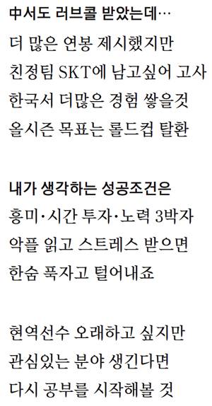 ▷SKT에서 오래 하고 싶은 생각도 있었고 정 때문에 남았다고 볼 수도 있지만 그 외에 다른 조건도 좋았다. 돈만 생각하면 중국도 매력은 있지만 여러 가지를 고려해서 남는 것이 좋겠다고 판단했다. 다른 사람들이 쉽게 할 수 없는 경험을 할 수 있는 직업이어서 프로게이머를 시작했던 거니까 돈보다는 다양한 경험을 하고 싶다. 그런 점에서 한국에 있는 것이 편할 수 있다고 생각했다. 물론 앞으로 해외에서 뛸 가능성이 전혀 없다고 생각하지는 않는다.