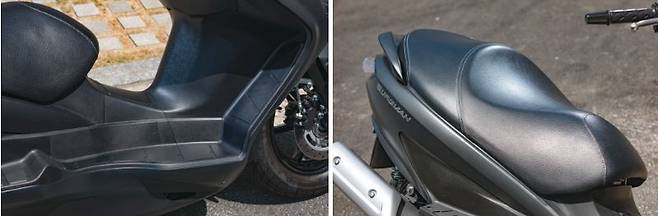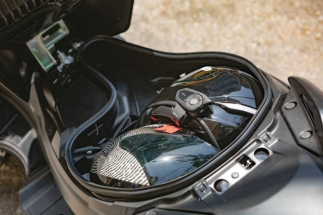 여기에 41리터의 시트 밑 수납공간은 풀페이스 헬멧 2개가 수납 될 뿐 아니라 서류 가방이 그대로 들어갈 만큼 넓다. 또한 대각선으로 긴 물건을 수납할 수 있도록 트렁크 한쪽을 길게 늘여놓은 것도 센스만점이다. 이 정도면 굳이 탑케이스를 달 필요가 없을 정도다. 사진 촬영을 위해 이동할 때도 카메라 가방 통째로 삼각대와 함께 시트 밑에 가볍게 넣고 이동했다.