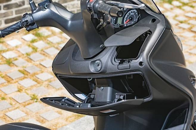 핸들 바 둘레는 6리터의 글러브 박스와 그보다 작은 1리터짜리 작은 수납공간이 자리 잡고 있다. 이걸 모두 합치면 상당한 양의 짐이 수납된다. 이정도면 맥시스쿠터에서도 흔치 않은 공간 활용 능력이다.