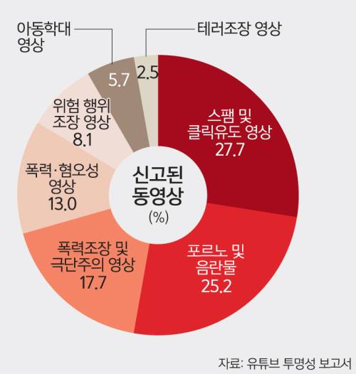 하지만 신고된 동영상의 성격은 삭제된 동영상과 유형에서 차이가 있다. 전체 신고 건 가운데는 클릭을 유도하는 스팸 영상이 27.7%로 가장 많았고, 포르노 및 음란물이 25.2%를 차지해 그 뒤를 이었다. 세 번째로 많이 신고된 영상 유형은 증오표현이 담긴 극단주의 영상(17.7%)이었는데, 총 743만2000여건의 신고가 접수된 것에 비해 실제 삭제된 동영상은 1만6000여건(0.6%)에 불과했다.