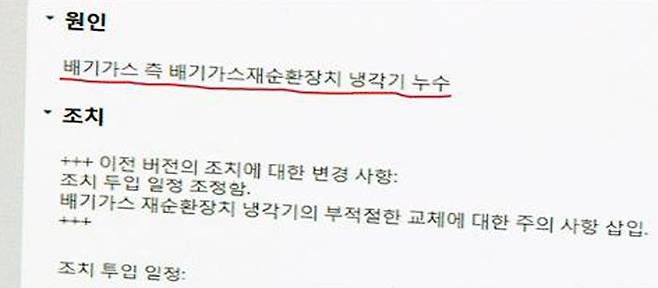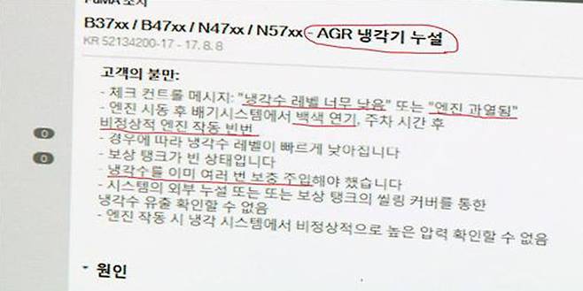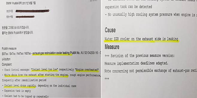 AGR(EGR) 냉각기 누설이란 제목의 자료에는 이번에 화재사태를 불러일으킨 BMW 디젤엔진에서 냉각수 레벨이 너무 낮고 엔진이 과열되며, 비정상적 엔진작동이 빈번하다는 고객의 불만 내용이 담겨있다. BMW 본사는 이런 문제점을 원인을 파악한 끝에 배기가스 재순환장치(EGR)의 냉각기 누수로 결론지었다.