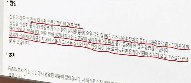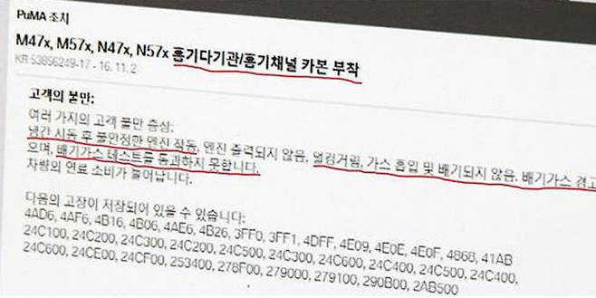 또, 2016년 배포된 또 다른 문서에는 이번 화재의 주요 요인으로 전문가들이 꼽는 '엔진 흡기다기관 내 카본 찌꺼기 과다누적'에 대한 내용도 담겨있다. 흡기다기관 카본부착이란 제목의 문서내용에는 불안정한 엔진작동과 덜컹거림 같은 문제점에다, 심지어는 배기가스 테스트를 통과하지 못한다는 고객들의 불만이 적시돼 있다. 이에 대해 BMW는 배기가스재순환장치(EGR)를 통해 발생하는 그을음과 오일찌꺼기 등이 흡기다기관 내에 쌓이면서 문제를 일으켰다는 자체 원인 분석을 기술해 놓았다.
