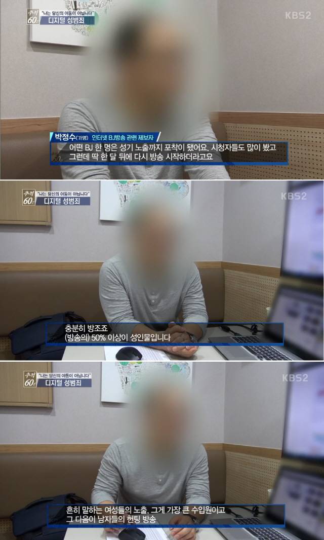 한 관계자는 인터넷 개인방송의 높은 수위를 비판하며 “어떤 한 BJ는 성기 노출까지 포착이 됐는데 한달 뒤 다시 방송을 시작했다”며 “50% 이상이 성인물이고, 여성들의 노출이 가장 큰 수입원이다”라고 제보했다.