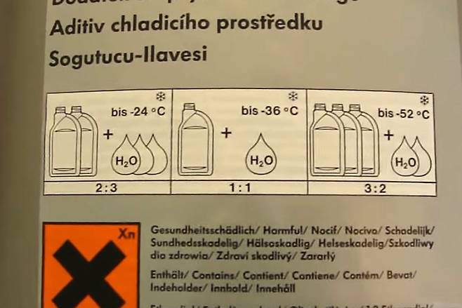 그냥 시중에 파는 부동액 원액을 넣으면 되지 않냐고도 할 수 있지만, 냉각수에서 부동액이 차지하는 비율이 높아지면 엔진의 냉각 효과가 떨어집니다. 또한, 너무 낮으면 동파 방지 효과를 기대하기 힘들어집니다. 국내에 출고되는 신차는 보통 50%(어는점 영하 36도) 혼합되어 있습니다. 우리나라 겨울은 영하 25도 아래로 내려가는 경우가 드물어 부동액의 비율을 40%(어는점 영하 25도)로 권장하는 경우도 있습니다.