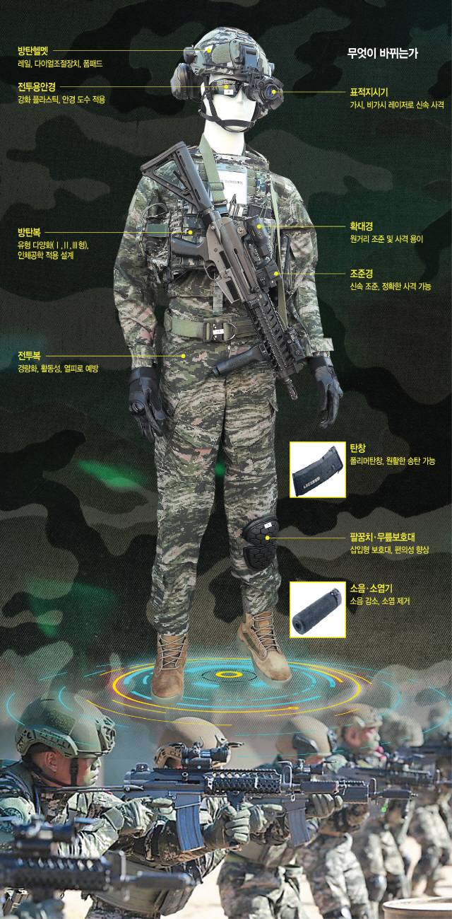 다만 해병대가 상륙작전 위주의 보병이라는 점에서 몇 가지 식별점은 있다. 방탄조끼에 부력을 넣거나 갯벌에서 벗어나기가 상대적으로 용이한 스웨이드 전투화, 각종 장구류의 신속한 부·탈착, 경량화보다는 방호력을 중시하는 방탄헬멧 등에서 차별이 두드러질 것으로 전망된다. 보병과 항공기 승무원, 기갑부대원 등 임무와 부대별로 워리어 플랫폼에 변화를 줬던 육군처럼 해병대도 부대별 차등화 방안을 강구하고 있다. 이 경우 대대별 차등화 방안이 유력하게 검토되고 있는 것으로 알려졌다. 대대별로 특성화 임무에 따라 공정, 산악, 기습상륙용 워리어 플랫폼이 필요하다는 얘기다. 이런 구상이 구체화하면 같은 연대 안에서도 대대별로 전투복이나 방탄조끼가 달라질 수 있다.