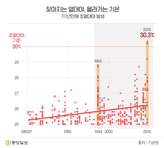 열대야 발생일수도 1994년 기점으로 달라집니다. 1994년 이전은 관측일 1054일 중 54일(5.12%)에 그쳤지만, 1994년 이후에는 775일 중 133일(17.16%)로 발생 비율이 확 늘었습니다.