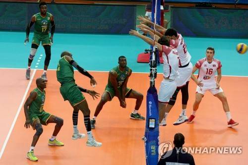 epa07015019 Nathan Wounembaina (2-L) of Cameroon in action during the 2018 FIVB Volleyball Men's World Championship Pool C match between Cameroon and Tunisia in Bari, Italy, 12 September 2018. EPA/ANNAMARIA LOCONSOLE